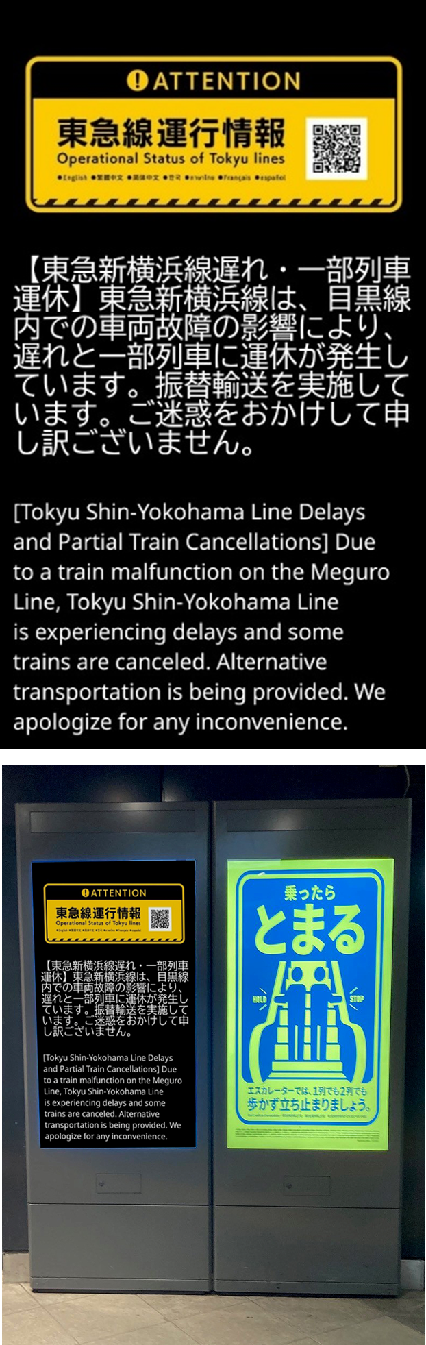 東急電鉄では、これまで悪天候や事故によるダイヤ乱れが発生した際、「東急線運行情報メール」や「駅係員による構内放送」により情報提供を行ってきた。しかし、音声放送や日本語中心の情報では、外国人や聴覚障がいのある利用者への伝達が十分ではなかった。