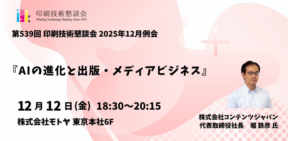 【2025年12月1日】印刷技術懇談会は12月12日、東京・八丁堀のモトヤ東京本社で「第539回例会」を開催する。
