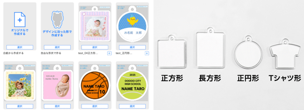 今回追加されたテンプレートは、文字や写真を差し替えることで印刷用データを作成できる仕組みで、正方形、長方形、正円形、Tシャツ形の4形状に対応する。