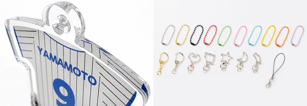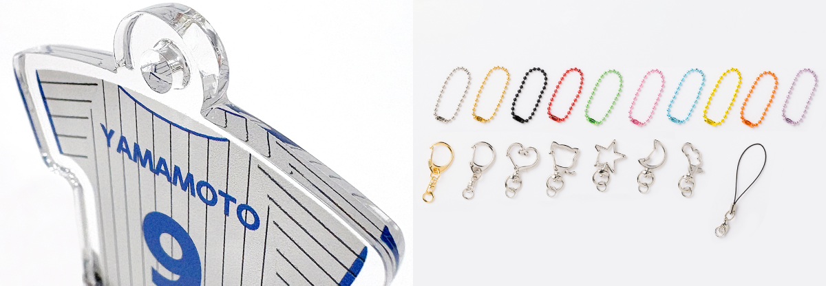 同社のアクリルキーホルダーはUV印刷方式を採用し、断面加工には「アイスメルトカット方式」を用いる。ストラップは18種類から選択でき、注文時に指定可能としている。参考価格は、正方形35×35ミリ、20日納期、200個注文の場合で1個あたり166.2円(税別)としている。
