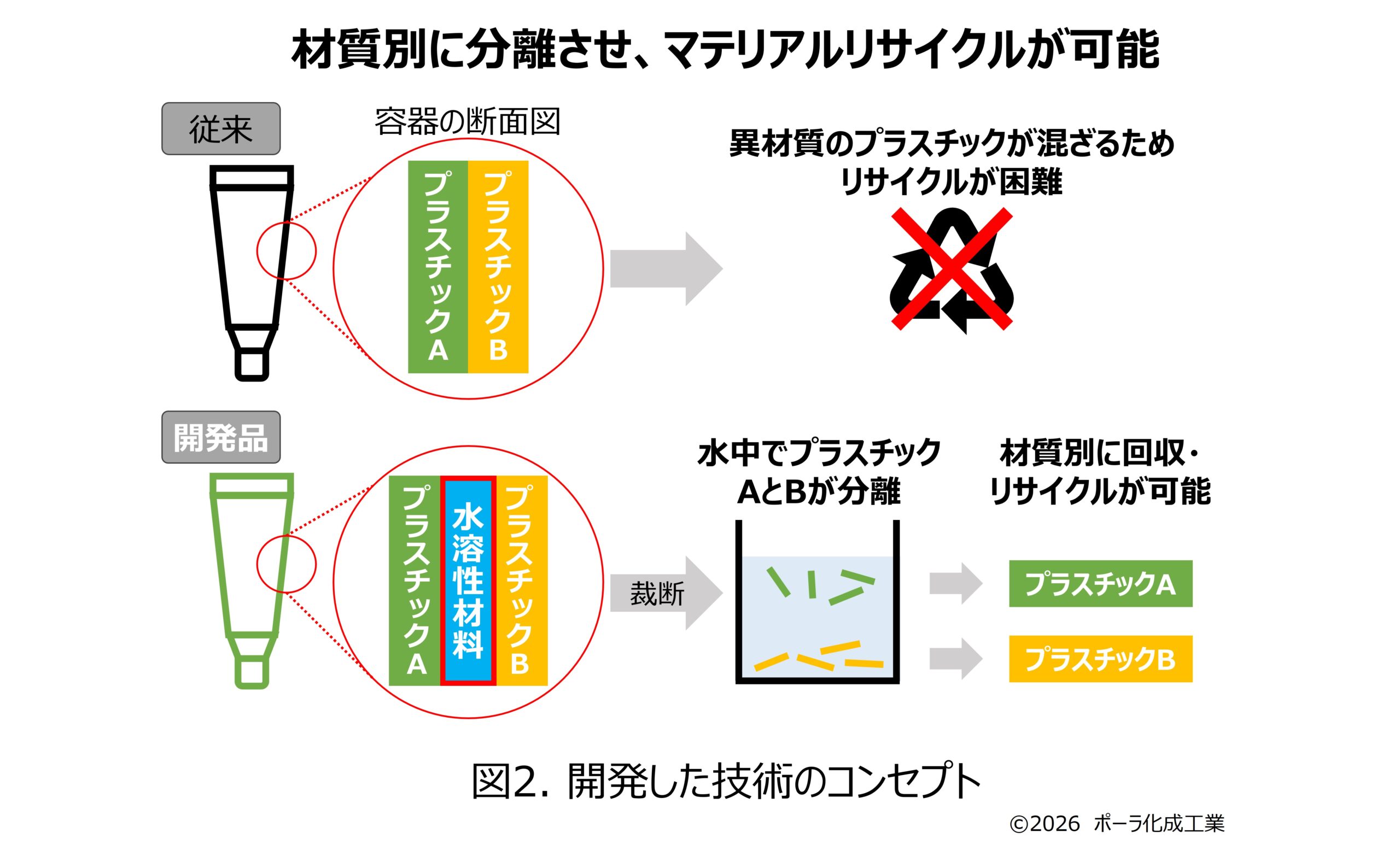 化粧品容器は、紫外線や酸素から内容物を保護する機能や使用性、デザイン性を両立させるため、複数のプラスチックを積層した構造が一般的である。一方で、異材質を強固に接着しているため分離が困難で、高品質なマテリアルリサイクルの障壁となっていた。