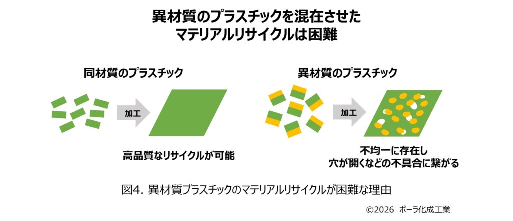 リサイクルは一般に、焼却時の熱を利用するサーマルリサイクル、化学的に分解して原料に戻すケミカルリサイクル、物理的に再資源化するマテリアルリサイクルの3種に分類される。マテリアルリサイクルは比較的低コスト・低エネルギーで資源循環が可能とされるが、異材質の混在は品質低下の要因となる。今回の技術はこの課題解決を目指すものである。