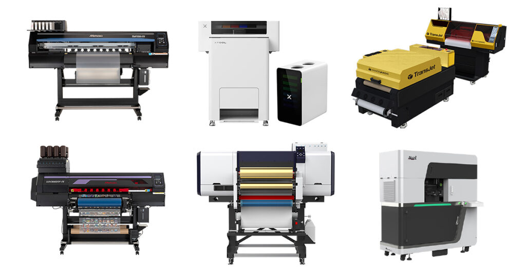 DTFプリンタの比較展示では、小型の「xToolアパレルプリンタ」をはじめ、最大印刷幅80cmの「TxF150-75」、量産向けモデルなど複数機種を紹介。新規参入から設備更新、増産までの用途に応じた機種選定のポイントを解説する。