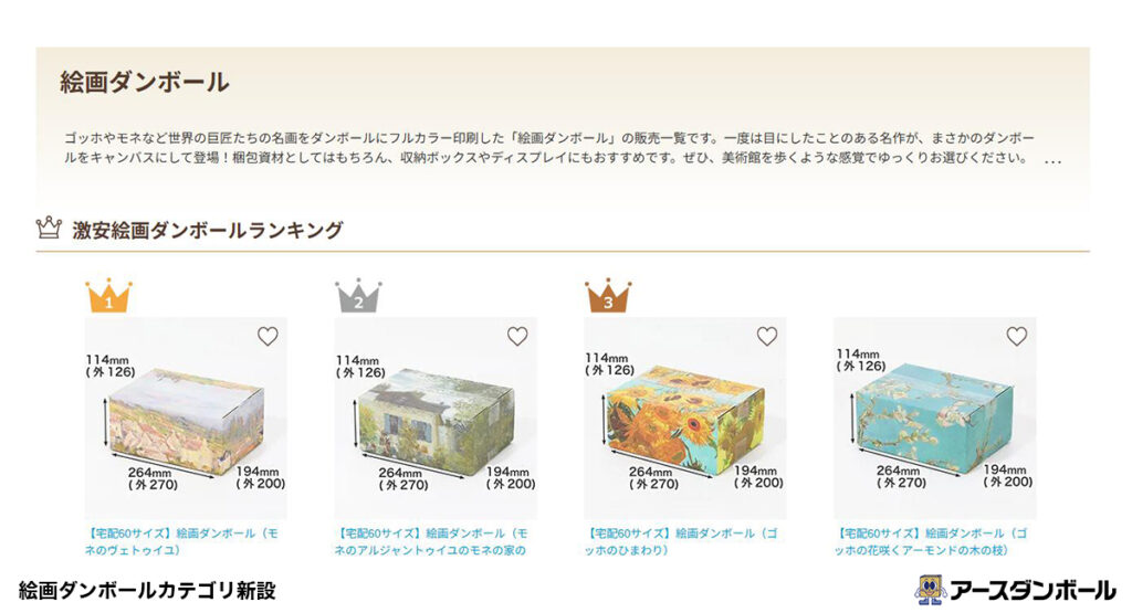 【2026年3月24日】アースダンボールは、自社ECサイトで「絵画ダンボール」カテゴリを新設し、商品ラインアップの拡充を進めている。