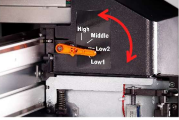 巻取り装置は、出力の開始/停止に連動して動作。ワンタッチのヘッド高さ調整機能もあり、4 段階(1.5 ㎜、2.0 ㎜、2.5 ㎜、4.0 ㎜)の高さ調整が、レバーの操作でできる。使用するメディアに最適なプリントヘッドの高さを選ぶことでメディアとの互換性が向上し、接触リスクを低減する。
