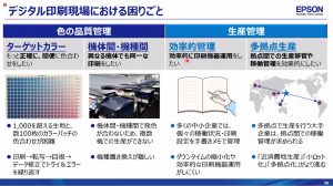 エプソンテキスタイル事業の価値創造スト―リーだが、アナログに比べデジタルはシンプルで納期も短く、廃棄ロスの削減も可能。また版が不要で、クリーンで安全な作業環境を提案できる。