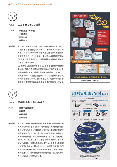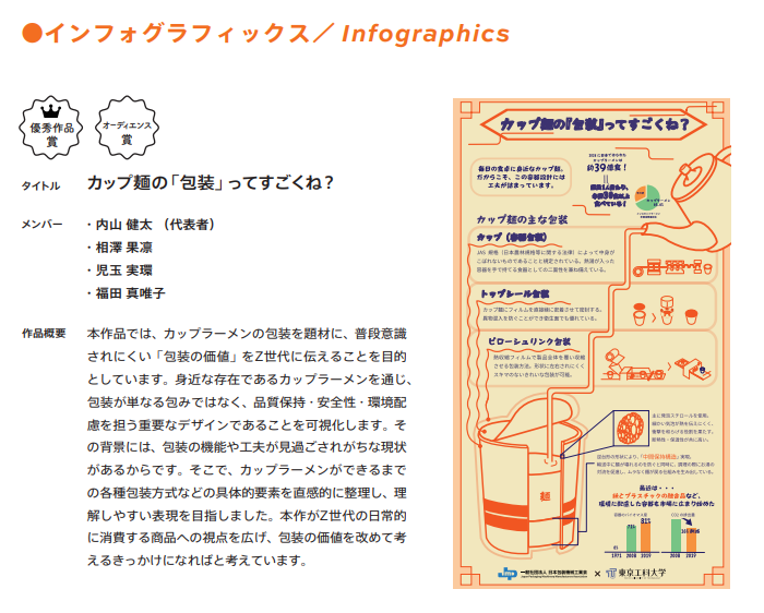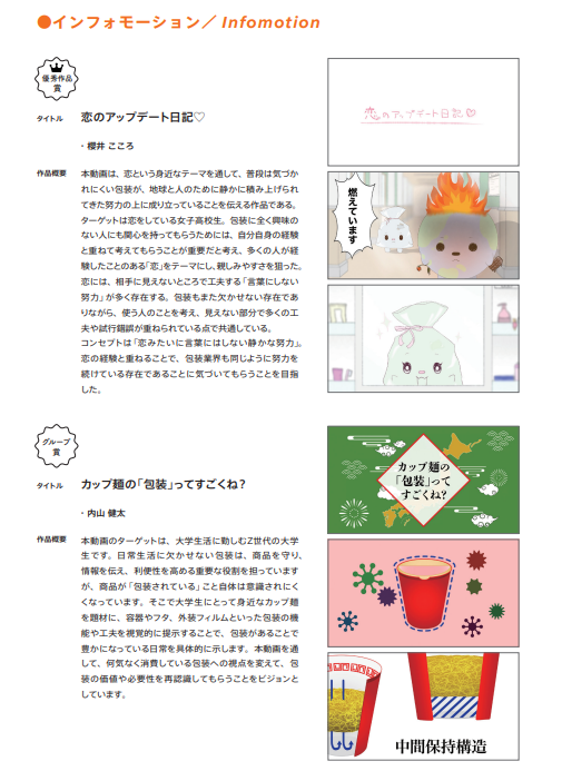 学習成果として、学生はインフォグラフィックス(画像)とインフォモーション(動画)を制作。「もし包装がなかったら」「包装が支える暮らし」「環境に配慮した包装」などのテーマを生活者の視点で表現した。