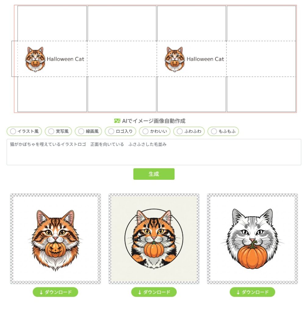 従来、Illustratorなどの専用ソフトを持たないユーザー向けにテンプレートやスタンプ機能を提供してきたが、新たにAIが自動でデザイン画像を生成・提案する機能を追加。生成された画像は同社のフルカラー印刷サービス「ミラプリ」で版代なしで印刷でき、そのままデザインデータとして活用できる。