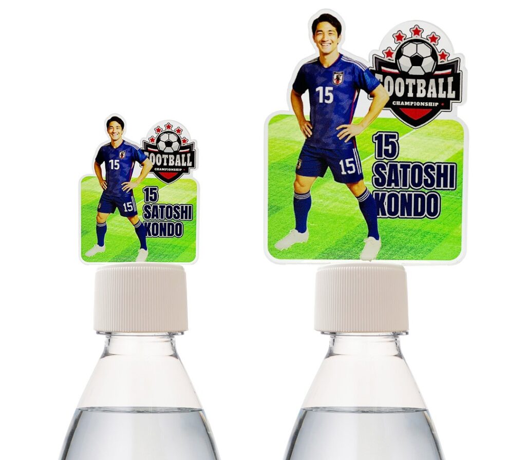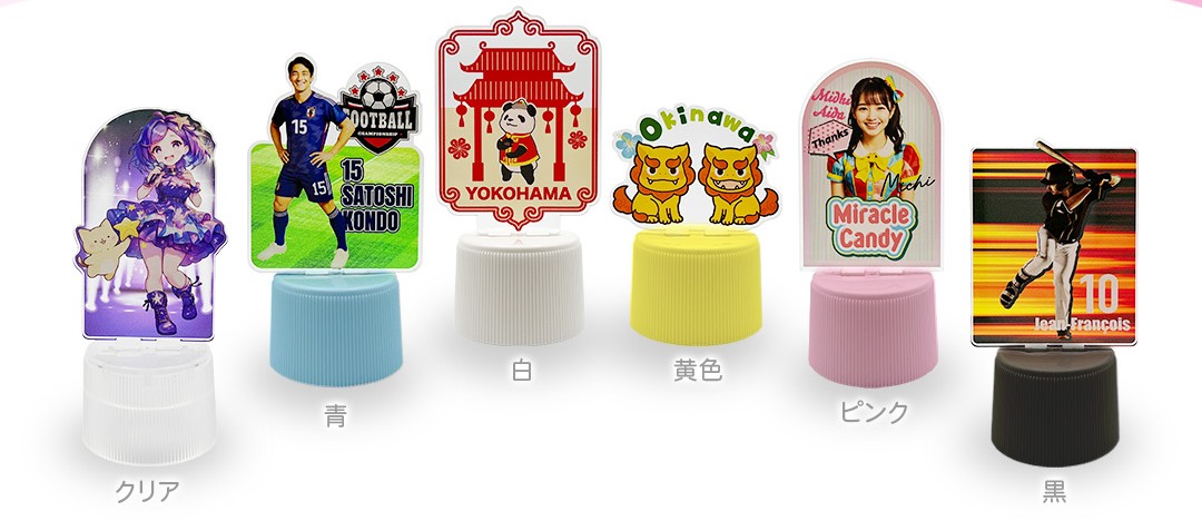 ボトルキャップは透明度の高いクリア仕様を含む6色展開。アクリルスタンド部分には高透明度のクリアアクリルを採用し、UVインクジェットによるフルカラー印刷でキャラクターやロゴを表現する。アクリルはダイカット加工により、人物やキャラクターのシルエットに合わせた自由な形状で制作できる。