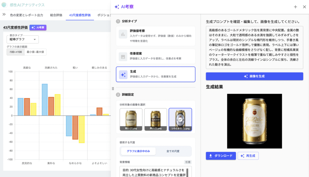 【2026年3月18日】感性AIは、マーケティングソリューション「感性AIアナリティクス」で、パッケージデザインやキャッチコピー制作を支援する新機能「着眼点ナビ」「AI改善生成」を実装した。