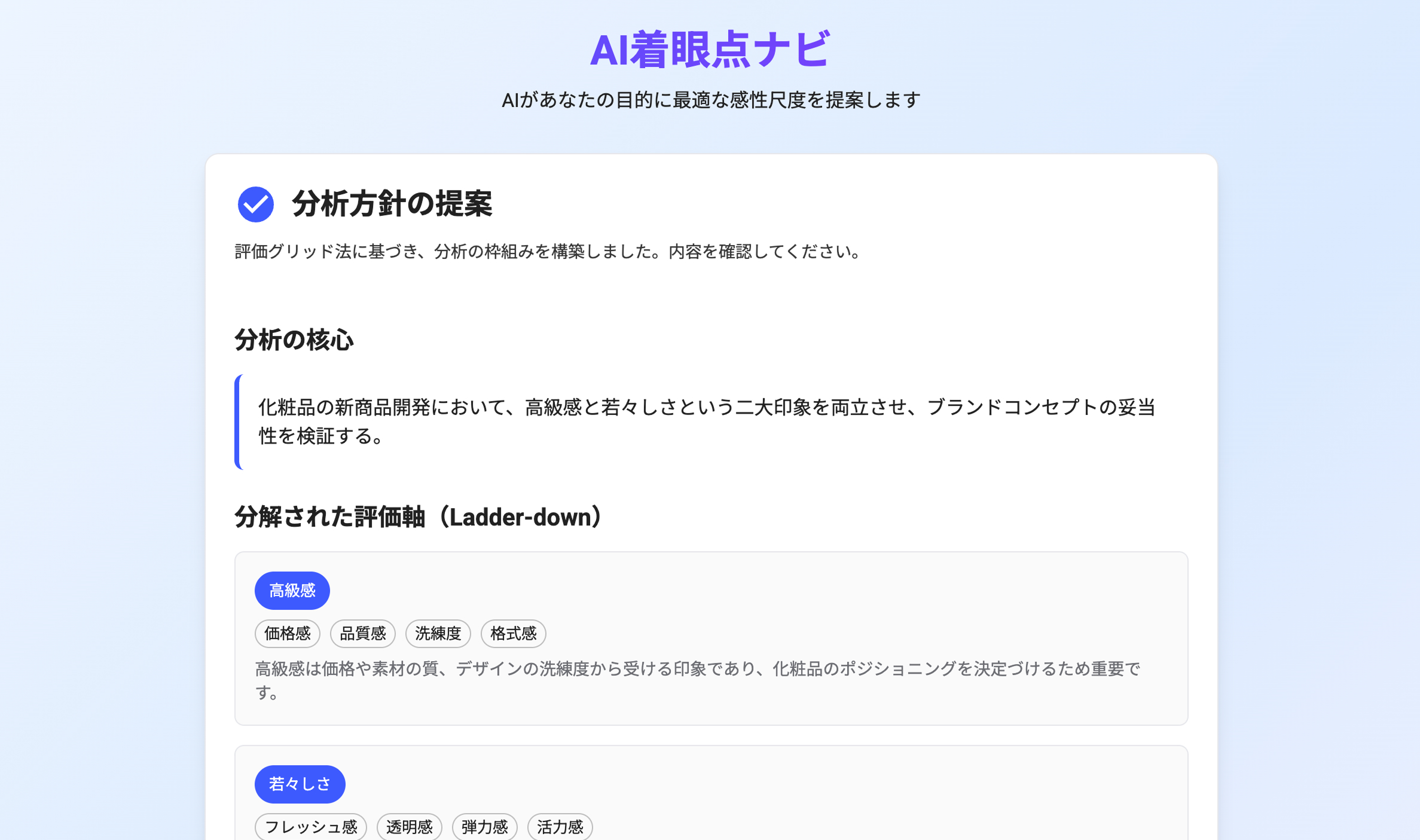 今回の機能強化では、評価設計と改善プロセスの自動化を図った。「着眼点ナビ」は、製品カテゴリやターゲット属性、ブランドコンセプトを入力することで、プロジェクトに適した評価軸をAIが自動抽出する。従来は43種類の感性尺度から手動で選択していた作業を効率化し、分析設計の精度向上につなげる。