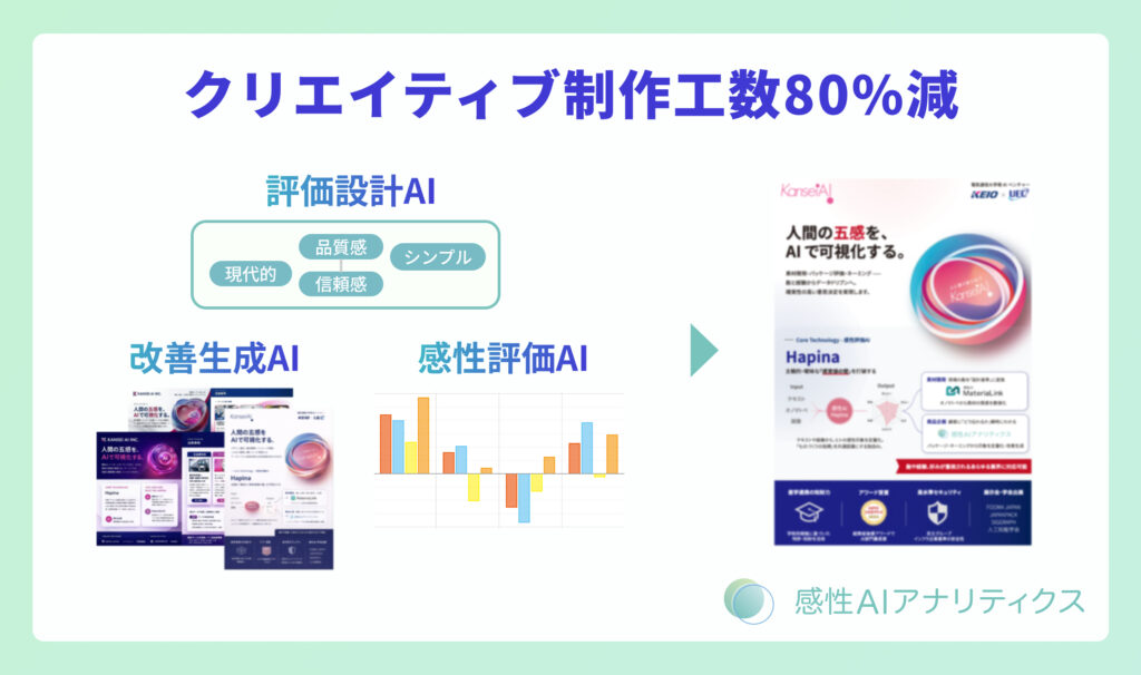 同社の検証では、「初期案作成」「評価」「改善案生成」「再評価」といった一連のプロセスを高速化し、従来2〜4週間を要していた制作サイクルを約2営業日に短縮、作業時間を約80%削減したという。