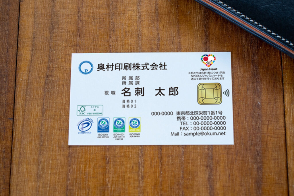 同「Smart Meishi」は、従来プラスチック製であったNFCカードの環境負荷を低減する目的で、紙とNFCタグを独自構造で圧着し、使用後の分別・リサイクルを可能にした。