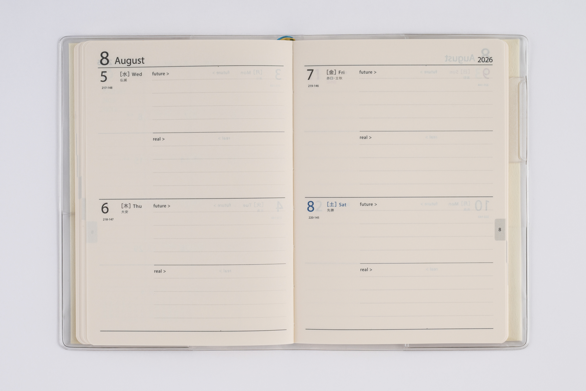 記入欄は1日分を「future」と「real」に分けた構造で、futureには翌日への期待や理想の行動を書き、realには実際に起きた出来事や気づきを記す形式を採用した。これを繰り返すことで、行動の変化や日々の発見を促す仕組みとなる。