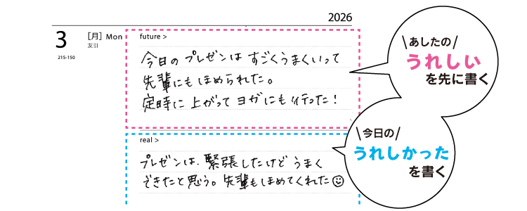 従来の日記が「その日に起きたことを書く」形式であるのに対し、同日記は「あした、こう過ごしたい」という未来の出来事を、あたかも起こったかのように前日に書く点が特徴である。未来を先に書くことで行動が変化し、前向きな一日を過ごせるようになるという考えで構成されている。