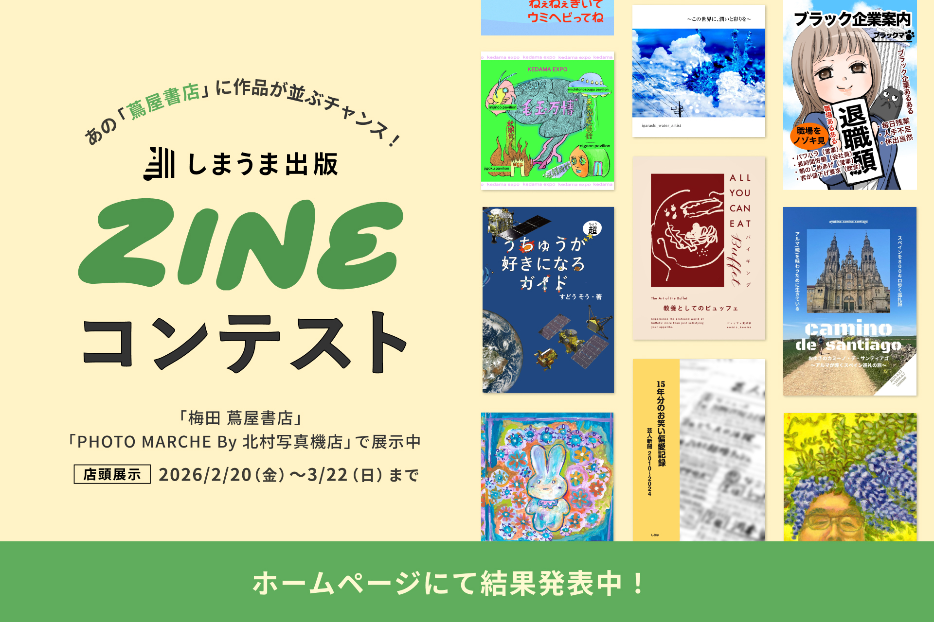 【2026年3月2日】しまうまプリントは、2025年末から実施していた「しまうま出版ZINEコンテスト」の入賞13作品を決定した。応募総数は300作品を超えた。2月20日(金)から3月22日(日)まで、梅田 蔦屋書店およびPHOTO MARCHE By 北村写真機店で全入賞作を展示・販売する特別フェアを開催する。