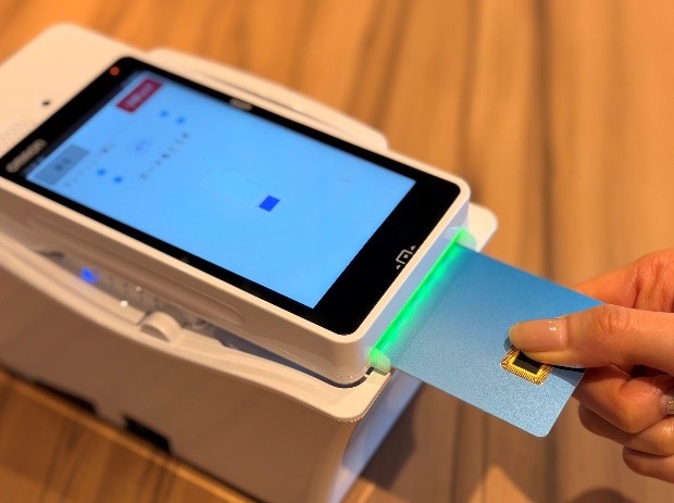 指紋認証カードは、カード右下に配置されたセンサーに登録済みの指を当てることで本人認証を行う仕組みである。認証処理はカード内部で完結するため、店舗側で新たな認証端末を導入する必要はない。これにより、非接触決済では金額上限を設けずに利用でき、接触決済でも暗証番号入力を省略できるなど、利便性とセキュリティの両立が期待される。