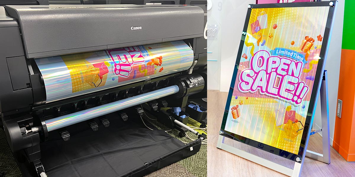 用途としては、店頭ポスター、展示会装飾、期間限定キャンペーン告知などを想定。通常の紙メディアとは異なる質感と反射効果により、販促空間の演出強化を図る。