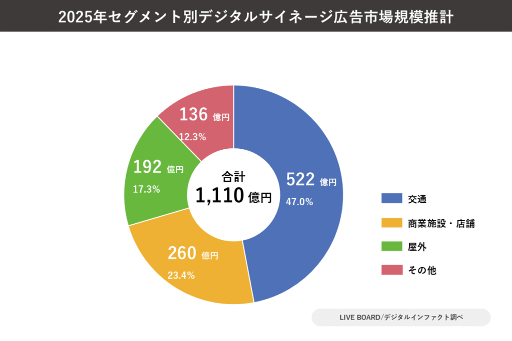 調査では、交通、商業施設・店舗、屋外(大型ビジョン)、その他の4セグメントに分類。交通分野が522億円で全体の47.0%を占め、商業施設・店舗が260億円(23.4%)、屋外が192億円(17.3%)、その他が136億円(12.3%)と推計された。