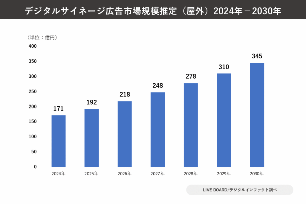 調査は、デジタルサイネージ広告関連事業者を対象に2025年7月から9月にかけて実施。LIVE BOARDおよびデジタルインファクトが保有するデータと、関連企業へのインタビューをもとに市場規模を推計した。