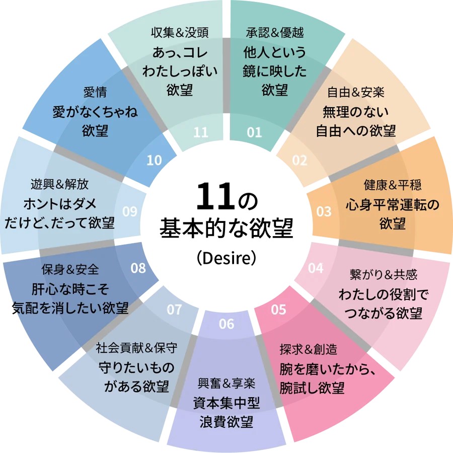 DDDは、年2回の調査で定量・定性データを収集し、消費者の「ほしい・したい」という気持ちを「11の欲望」として体系化している。この指標により、商品やブランドに対する需要の源泉となる深層心理を可視化できるとしている。