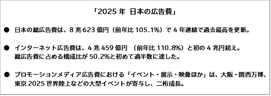 企業業績の回復を背景にデジタル投資が拡大したほか、大型イベントの開催なども市場を押し上げた。動画広告やSNS広告の伸長により、インターネット広告費は総広告費の50.2%を占め、初めて過半数に達した。