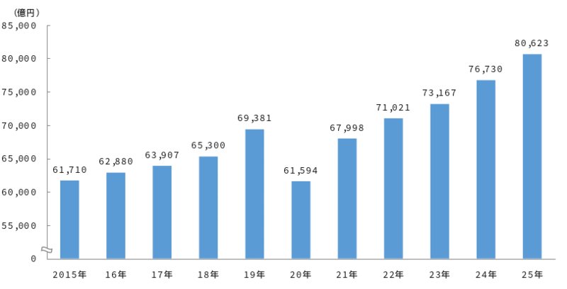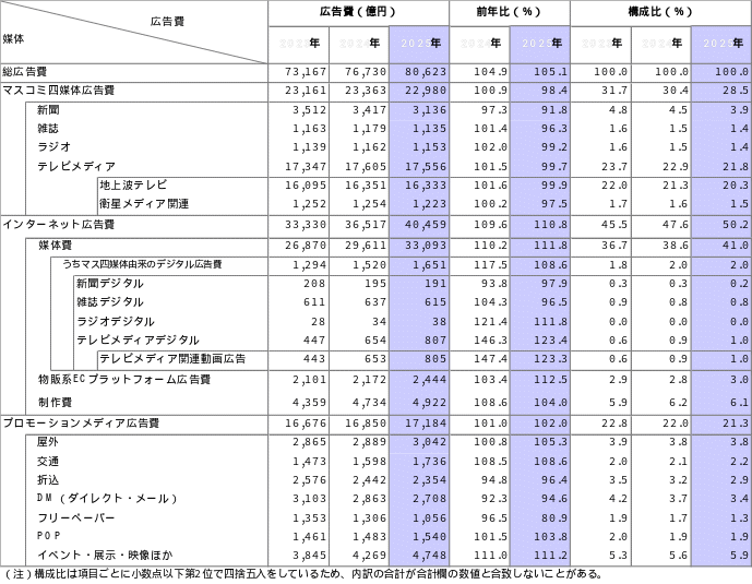 【2026年3月9日】電通は、日本の総広告費や媒体別・業種別広告費を推計した「2025年 日本の広告費」を発表した。2025年の総広告費は8兆623億円(前年比105.1%)となり、2021年から5年連続で成長し、4年連続で過去最高を更新した。