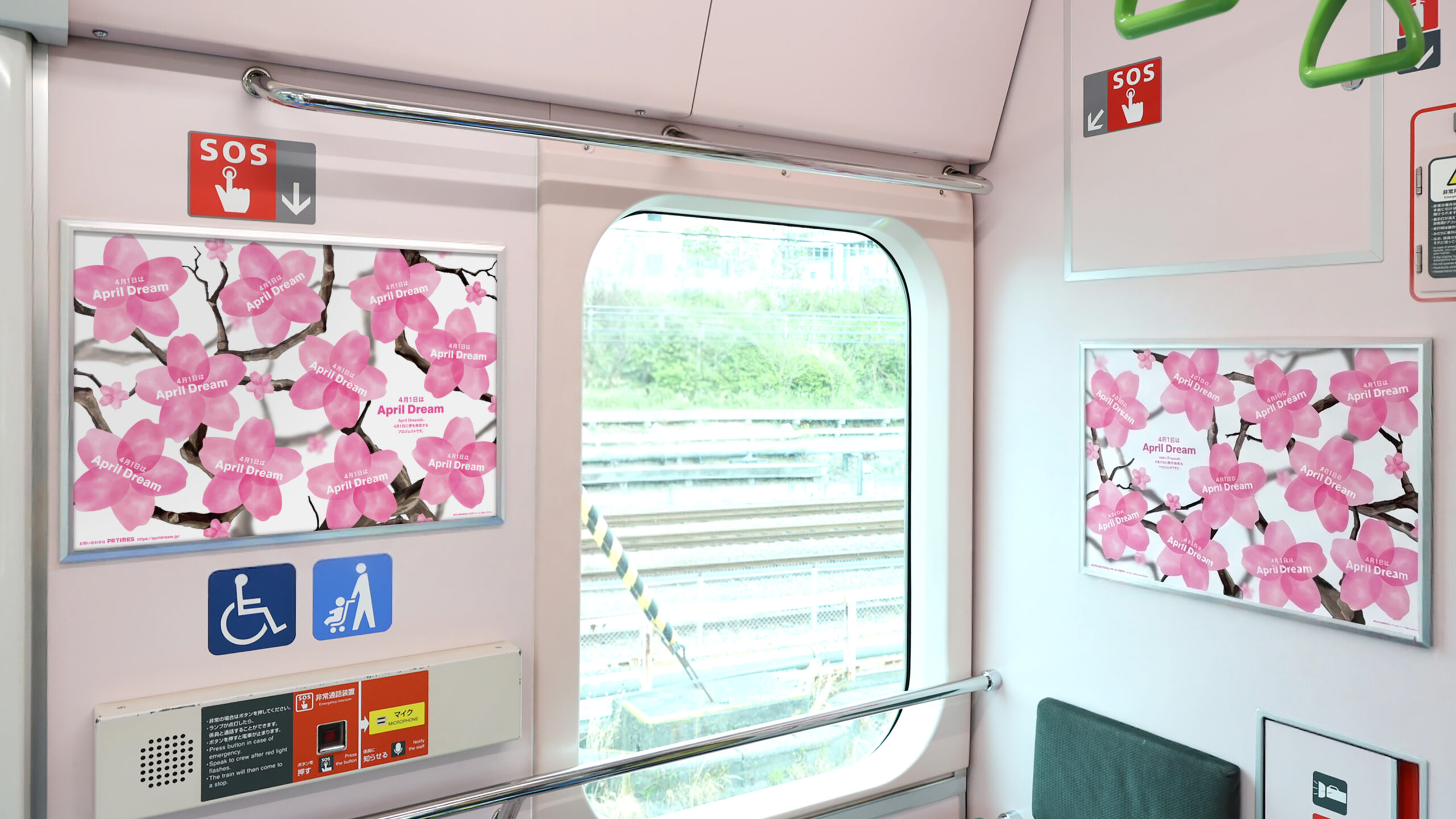 さらに、各車両内のドア横ポスターでは個人・企業の夢を一覧形式で掲出し、中吊りと連動したストーリー性のある情報設計とした。車内のデジタルサイネージでは、桜の開花とともに夢が次々と表示される3D映像を放映し、静止グラフィックと動画を組み合わせたクロスメディア展開を行う。