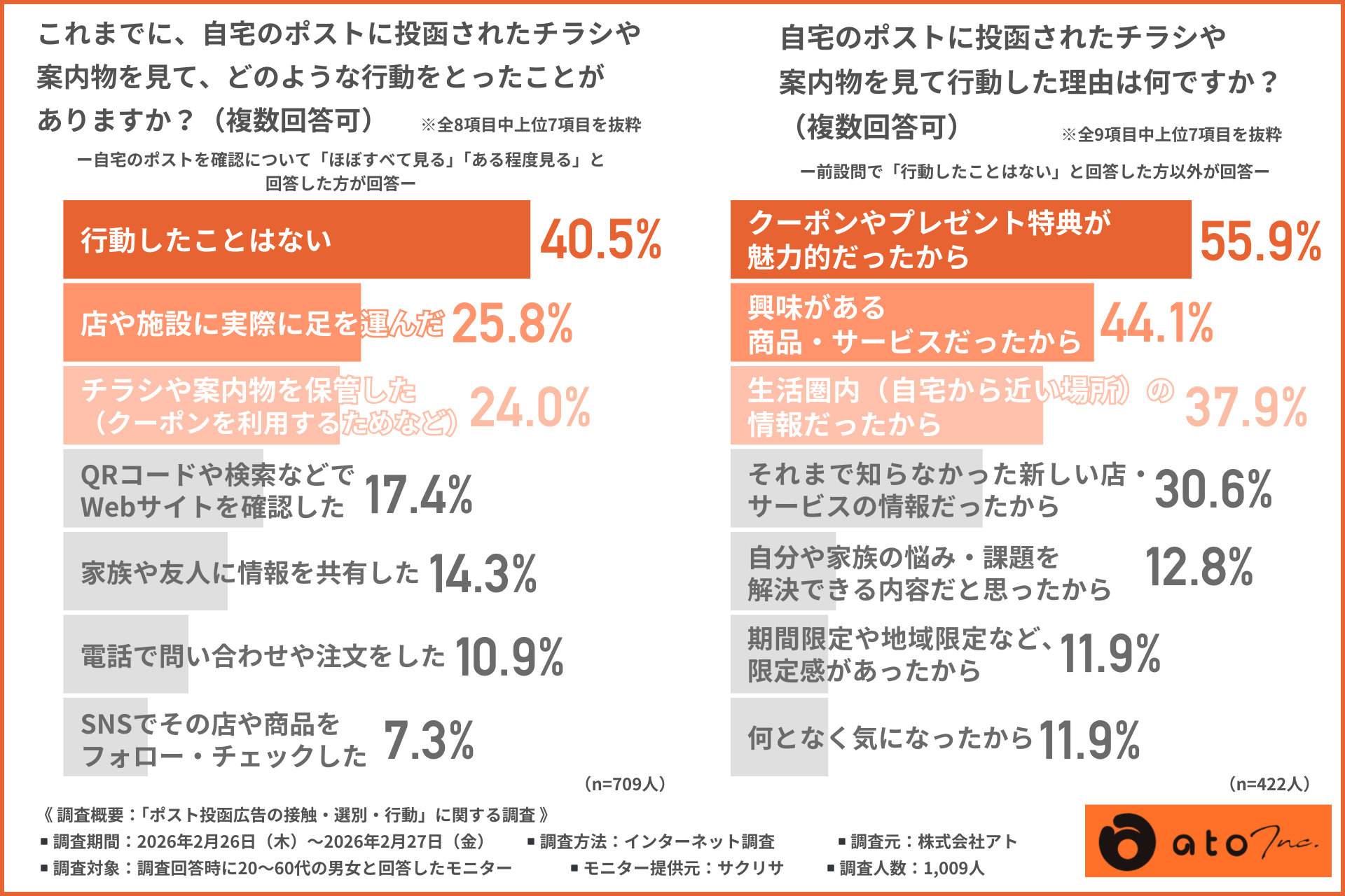 【2026年3月31日】ポスティングサービスを手がけるアトは、20~60代の男女1,009名を対象に「ポスト投函広告の接触・選別・行動」に関する調査を実施した。