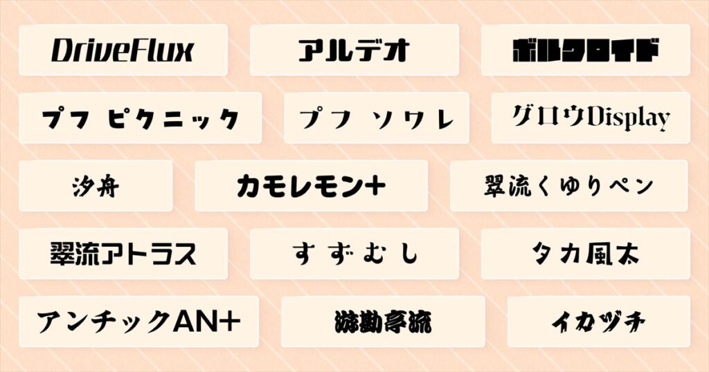 提供するフォントは、バリアブルフォント「DriveFlux」から厳選した7スタイルに加え、「プフ ピクニック」「すずむし」「イカヅチ」など人気のデザイン書体を中心とした計15書体。pixivFACTORYのテキスト入力機能で利用でき、アクリルキーホルダーやTシャツ、ポスターなど70種類以上のオリジナルグッズ制作に活用できる。